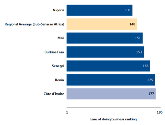 Figure 1: How Côte d’Ivoire and comparator economies rank on the ease of doing business. From World Bank. (2013). Economy Profile: Côte d’Ivoire. In Doing Business 2013 (10th ed.), p.7. Retrieved from: